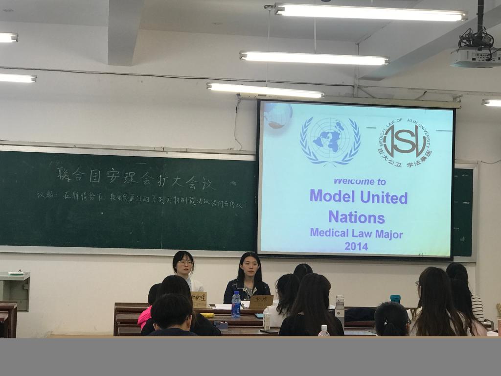 模拟联合国会议议题的仿真学术模拟,是世界范围内广泛开展的具有重要影响力的青年公民教育和思维训练活动。吉大模联代表队也多次获得国内外比赛佳绩。鉴于此,2018522日,2014级医事法学专业的同学们在国际法课堂上开展了一场别开生面的的模拟联合国安理会扩大会议,议题为“在新情势下,联合国通过的系列对朝制裁决议何去何从”。大会在主席徐一铭同学的主持下有序开展。在正式辩论环节,由各位同学以联合国成员国国家代表的身份提出立场文件并在大会上发言,而且韩国代表和中国代表两次提出的动议得到通过,各国代表就其展开有主题讨论。